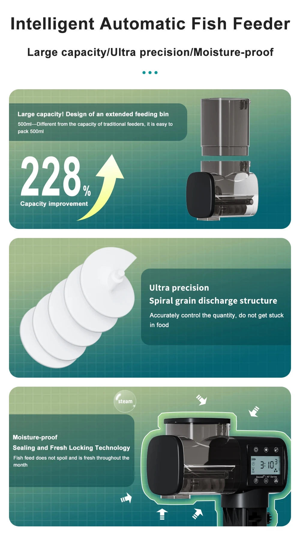 Timer Feeding:This automatic fish feeder has 3 different timer setting modes,and series up to 6 feedings per day, Both of the feeding time can be freely selected.