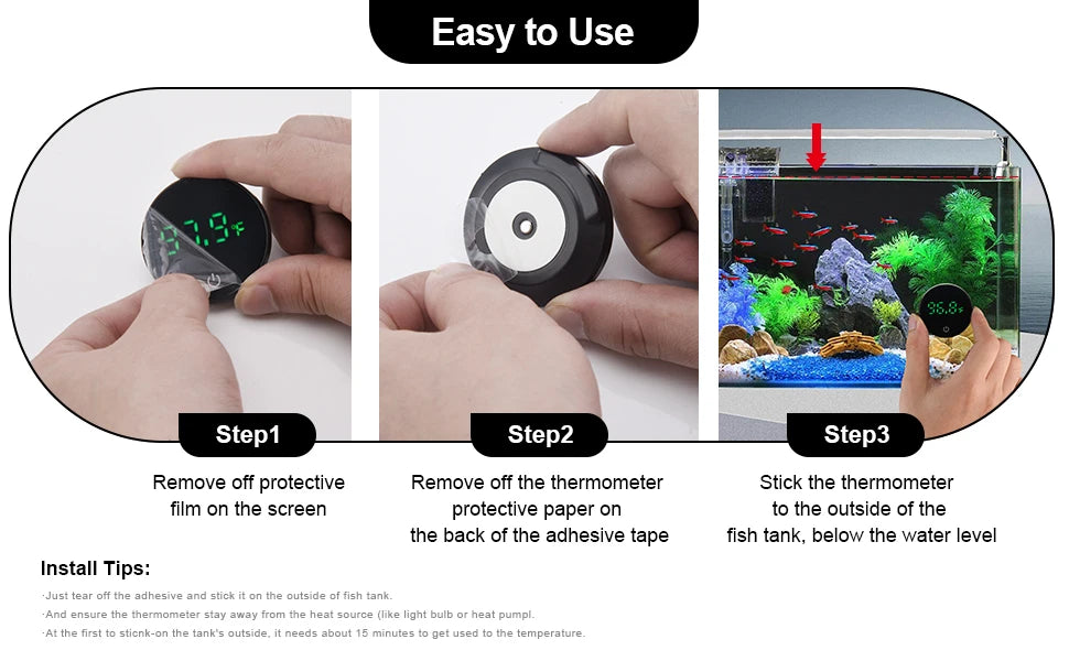 Simply remove the double-sided adhesive backing to attach the device to the outside of your fish tank.