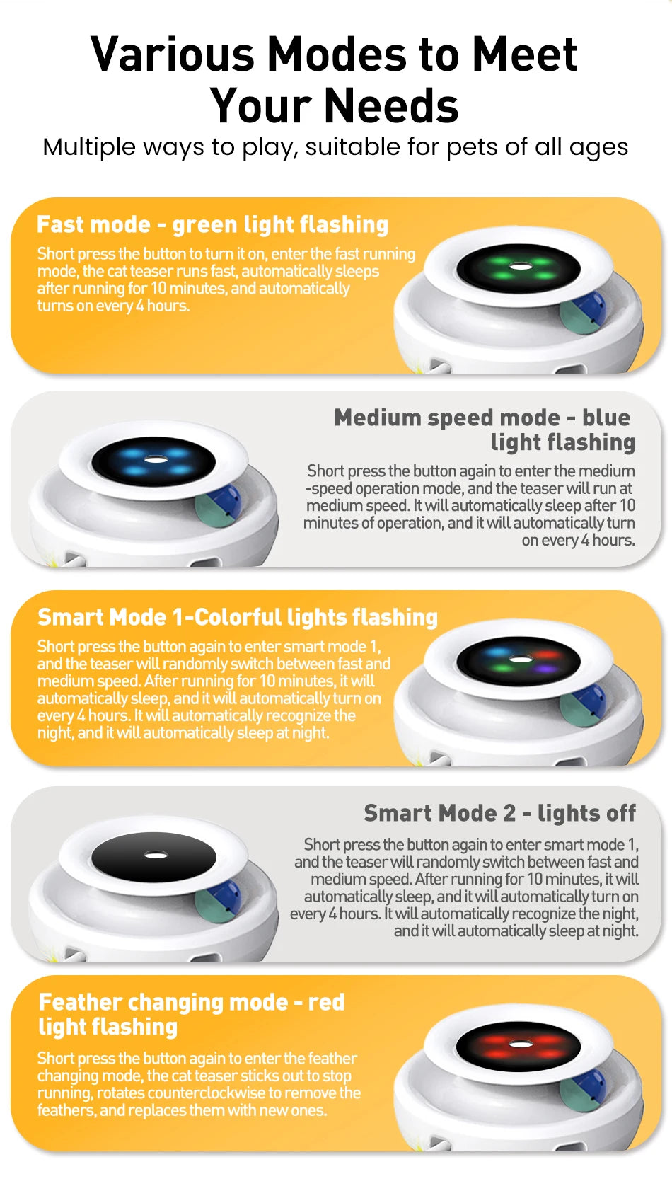 Featuring automatic movement and an enticing feather ball, it captivates pets to encourage natural hunting instincts and active play. With five adjustable modes, this electronic toy offers varied stimulation to keep pets engaged and prevent boredom.