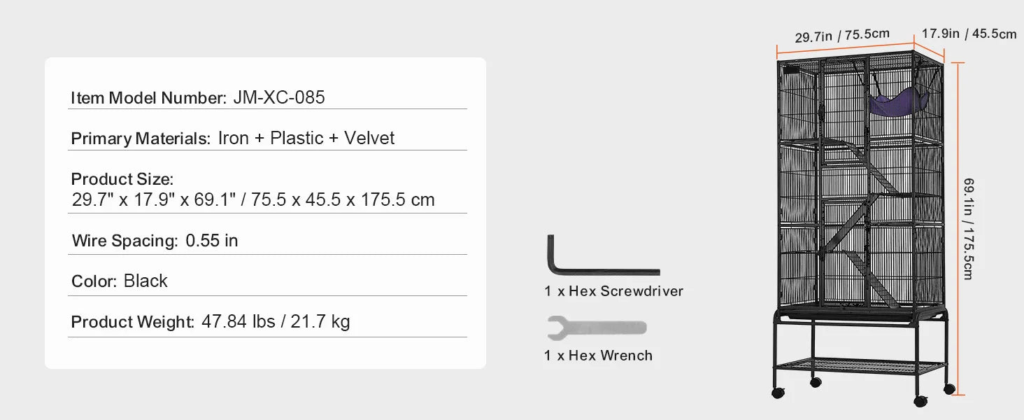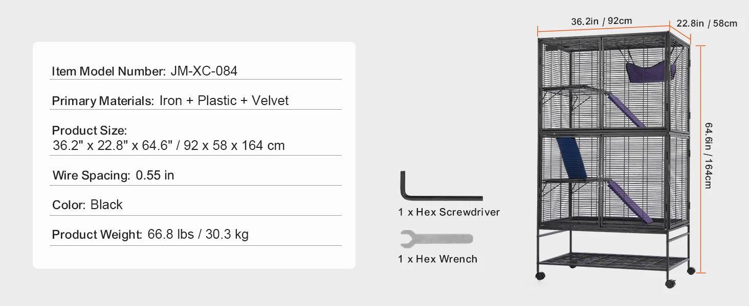 Spacious Living Area: Provide your pets with a roomy ferret cage. With 4 different height platforms and 3 slip-proof ramps, it accommodates multiple pets and provides them plenty of entertainment and exercise options. Enjoy comfortable experience with the top hammock!